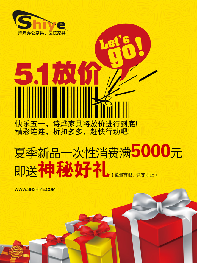 各位新老客戶,上海詩(shī)燁在“五一”購(gòu)物之季,為感謝廣大新老客戶一直以來(lái)的支持和信任,特開(kāi)展"來(lái)就送、買(mǎi)還送、好禮送不斷" 打折、促銷、送禮活動(dòng),回饋客戶,詩(shī)燁家具促銷即將開(kāi)始!請(qǐng)有需要購(gòu)買(mǎi)產(chǎn)品的客戶,抓緊時(shí)間選購(gòu)你需要的產(chǎn)品。一樣的產(chǎn)品, 更加實(shí)惠的價(jià)格,就在詩(shī)燁促銷季。